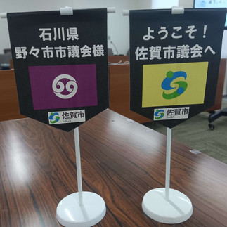 説明会場の机には、2024年に開催された「国民スポーツ大会(国スポ)」の際に使用された旗を活用し、野々市市の視察を歓迎する特製旗を掲げていただいていました。佐賀市は「国体」から「国スポ」へと名称変更された初めての開催地であり、その象徴的な旗を使ったおもてなしに、視察団一同感激しました。