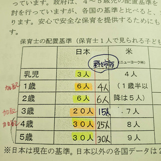 日本の保育士の配置基準、保育士1人が世話する子どもの数の配置基準は、欧米に比べて極端に低いのです。特に、3歳児20人に保育士が1人(アメリカは7人)、4歳児30人に保育士1人(アメリカは8人)、5歳児30人に保育士1人です(アメリカは9人)。野々市市は、保育の質を高めるために、国の基準より手厚い支援をしています。
