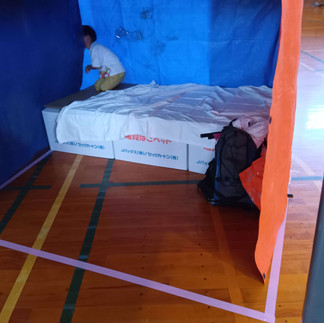 体育館では、避難所の国際基準である「スフィア基準」に基づき、1人あたり3.5㎡の必要スペースをピンクのテープで区切り、実際にテントを立てて体感していただきました。段ボールベッドや持参した防災袋を置くと、想像以上の狭さに驚かれる方も多く、毛布の薄さから「シーツかと思った」との声もありました。こうした気づきが、今後の備えに繋がります。