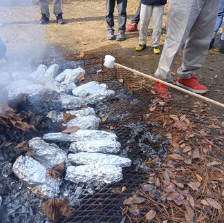 野々市市で食や地域活動を通じて「居場所」づくりに取り組む市民団体「nono1(ののいち)みんなの食堂」が、御経塚史跡公園で、焼き芋作りを中心とした交流会を開きました。地域のさまざまな団体などが協力し、家族連れ50人が広場で落ち葉拾いから始めて、熊手やほうきを使って子どもたちは一生懸命に落ち葉を集めました。その後、サツマイモを新聞そしてアルミホイルで包み、落ち葉のたき火で焼き芋を作っていました。焼ける間に、子どもたちは竹くしの先にマシュマロを刺して こんがり焼けたマシュマロの味を楽しんでいました。サツマイモは、石川県立大学(末松)が寄付したものなどです。